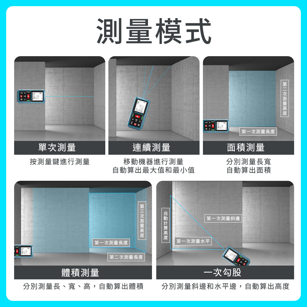 測量模式:單次/連續/面積/體積/一次勾股/二次勾股/最大/最小值