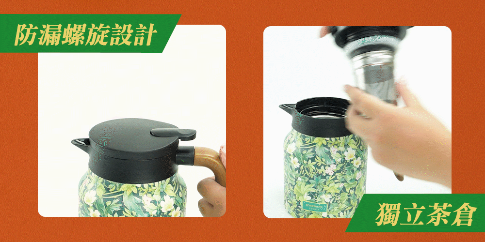 本款 316 不鏽鋼保溫茶壺,實測保溫效果可達 24 小時,耐用值大幅度提升,讓你無時無刻都能享受清透茶水的醇香。黃金容量 800ML,真空隔熱、防漏按壓設計,單手就能輕鬆出水。花草樣式的霧面外漆搭配貼合手型的木紋手把,實用以外也讓居家質感大升級。