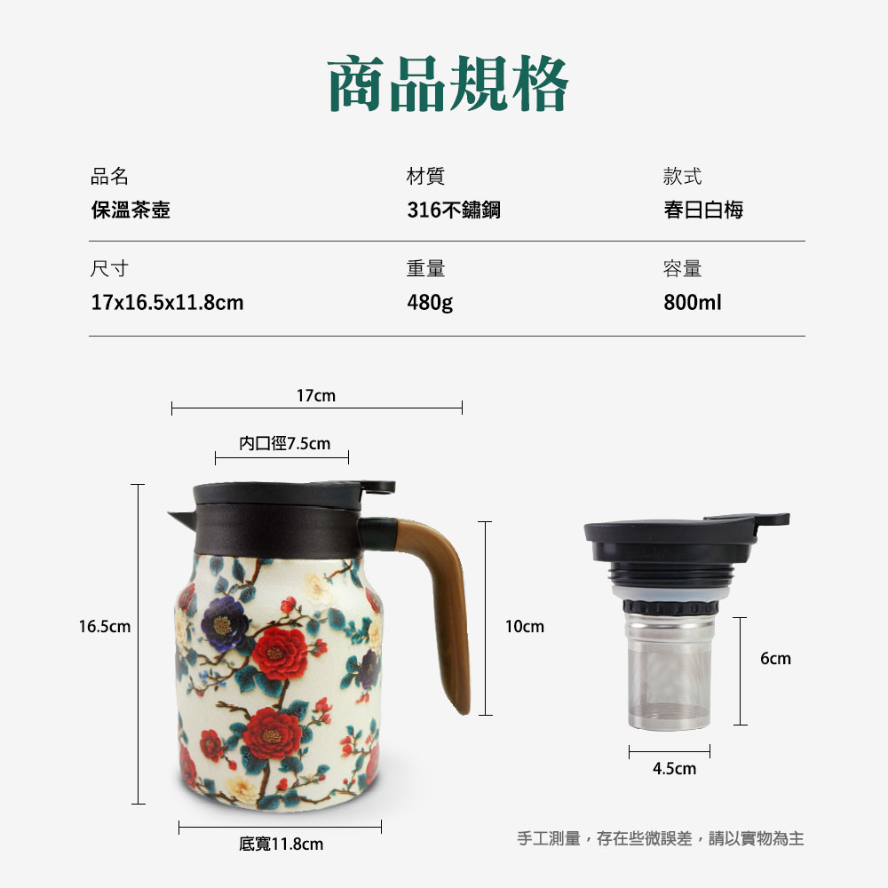 產品名稱:SHM-TEAPOT02_不銹鋼316保溫茶壺(800ML/春日白梅)
