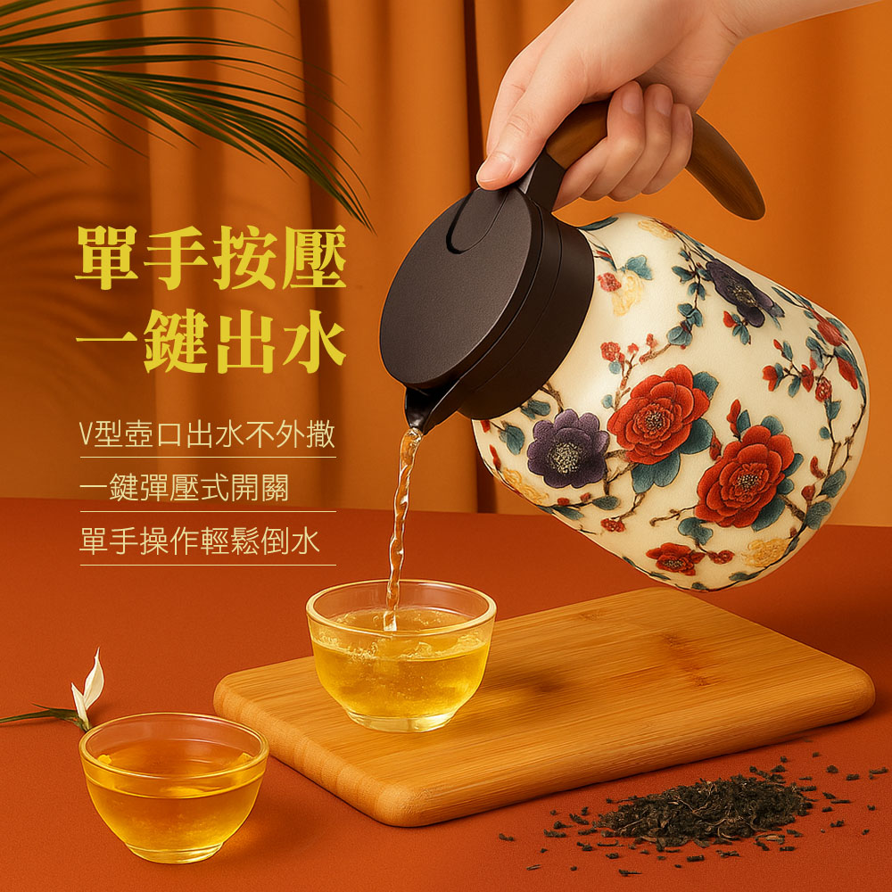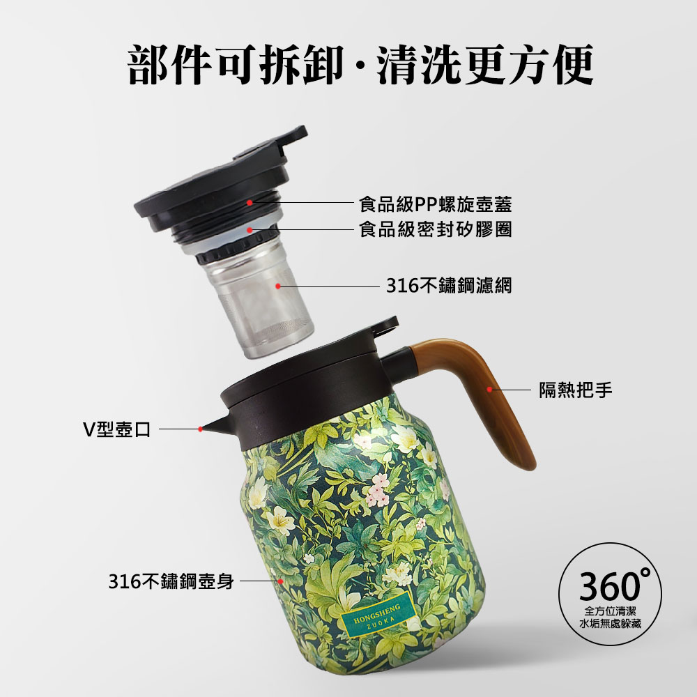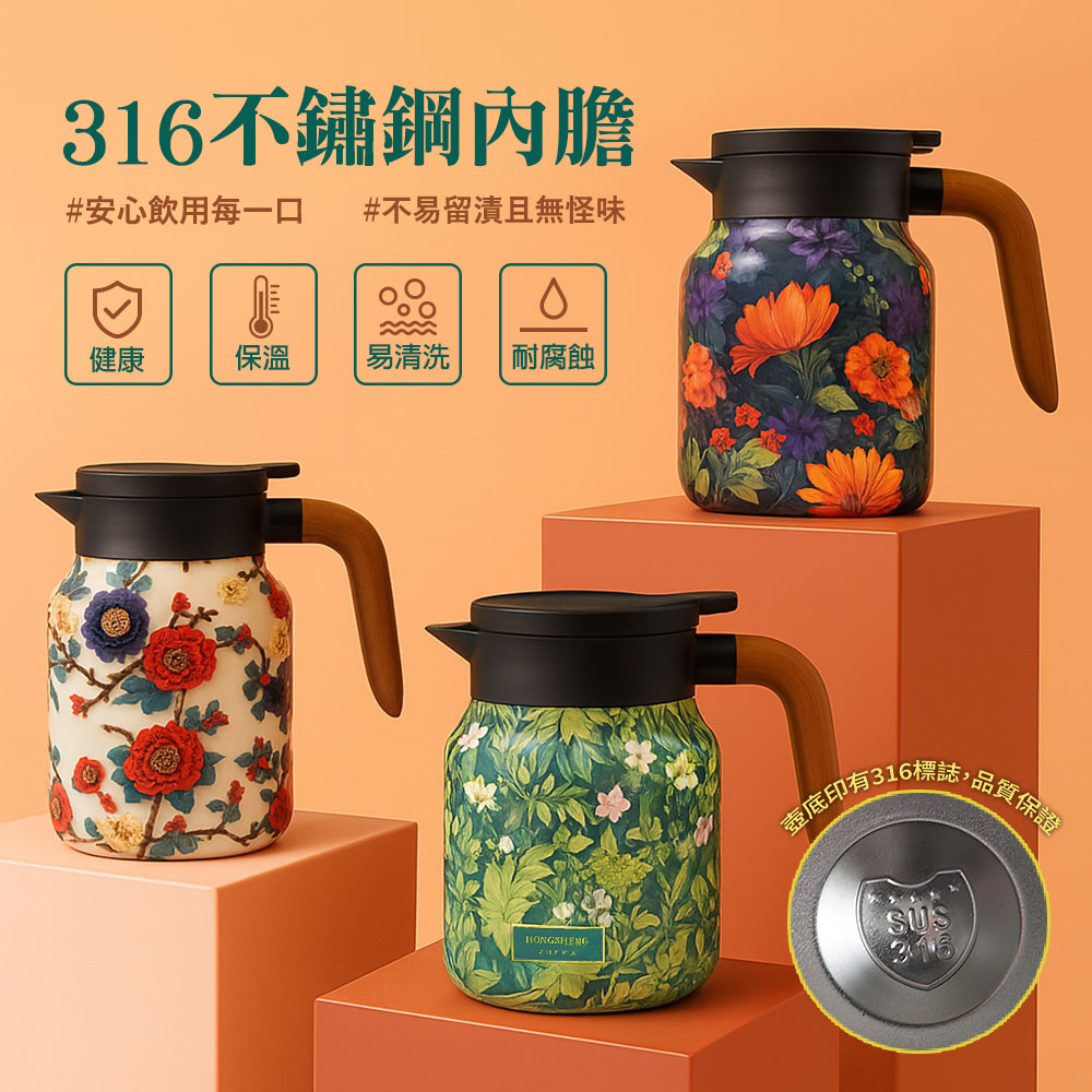本款 316 不鏽鋼保溫茶壺,實測保溫效果可達 24 小時,耐用值大幅度提升,讓你無時無刻都能享受清透茶水的醇香。黃金容量 800ML,真空隔熱、防漏按壓設計,單手就能輕鬆出水。花草樣式的亮面外漆搭配貼合手型的木紋手把,實用以外也讓居家質感大升級。