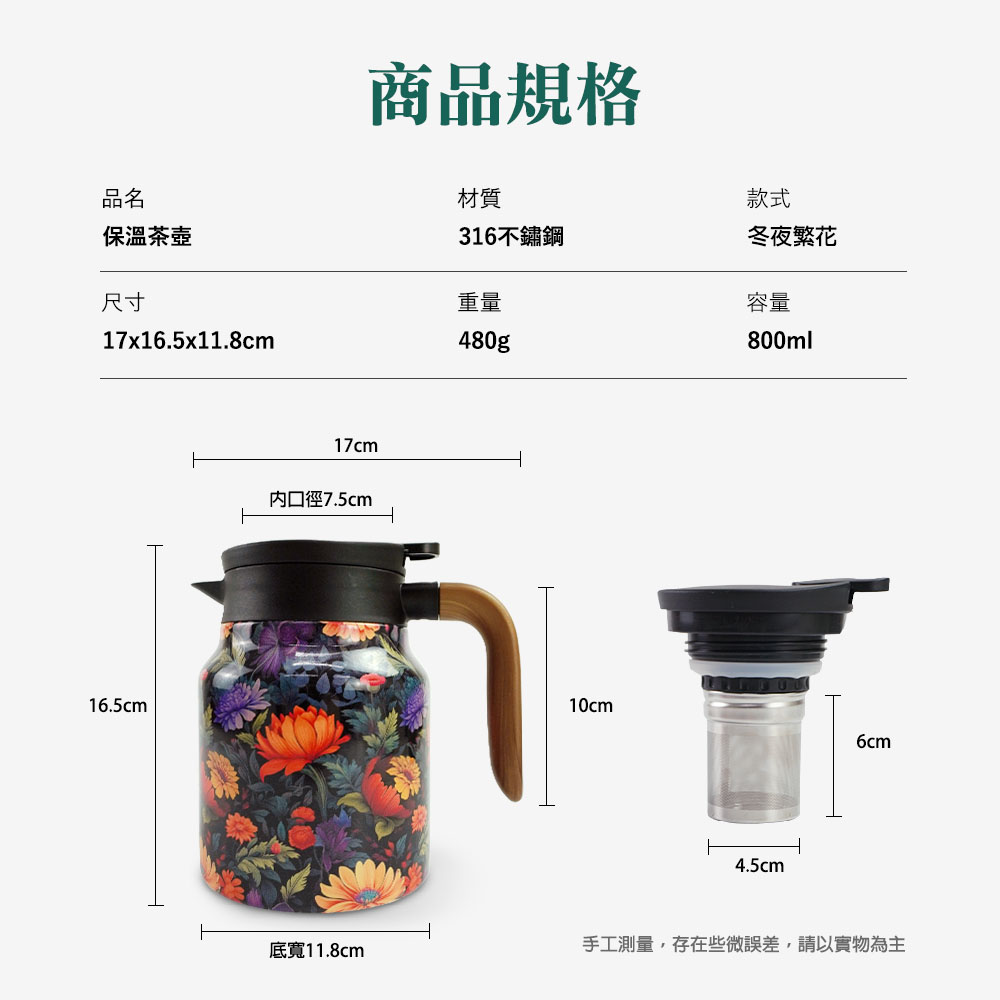 產品名稱:SHM-TEAPOT03-不銹鋼316保溫茶壺(800ML/冬夜繁花)