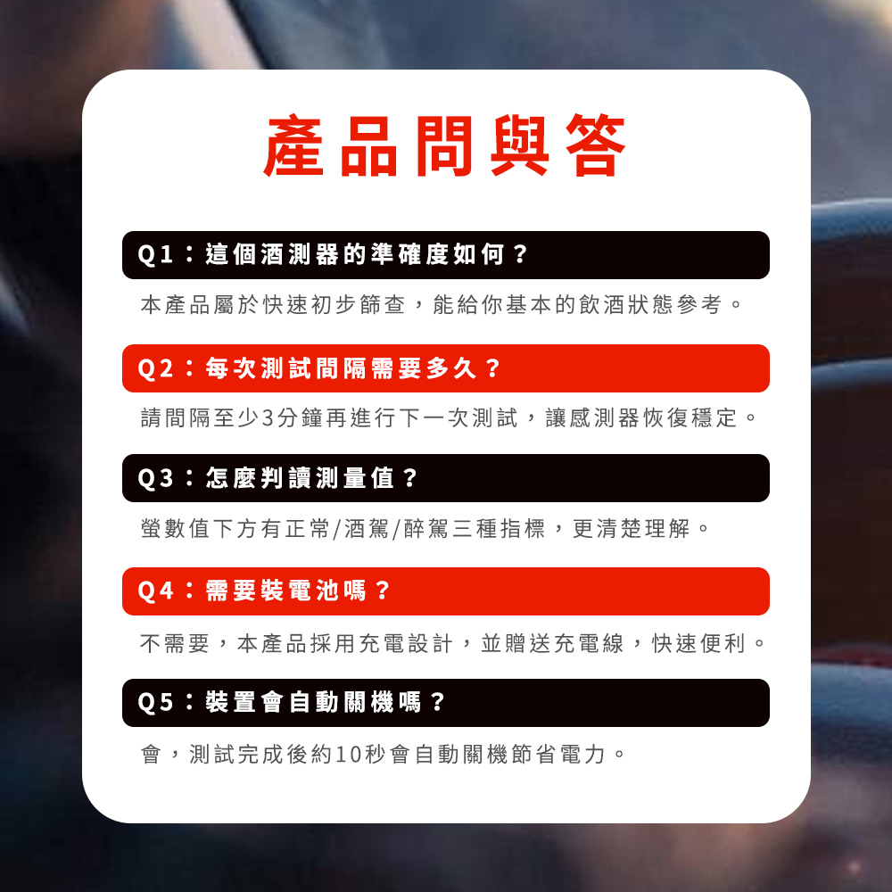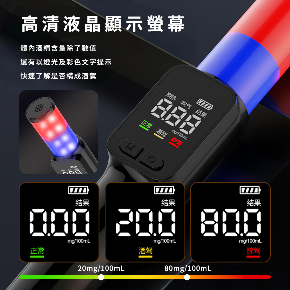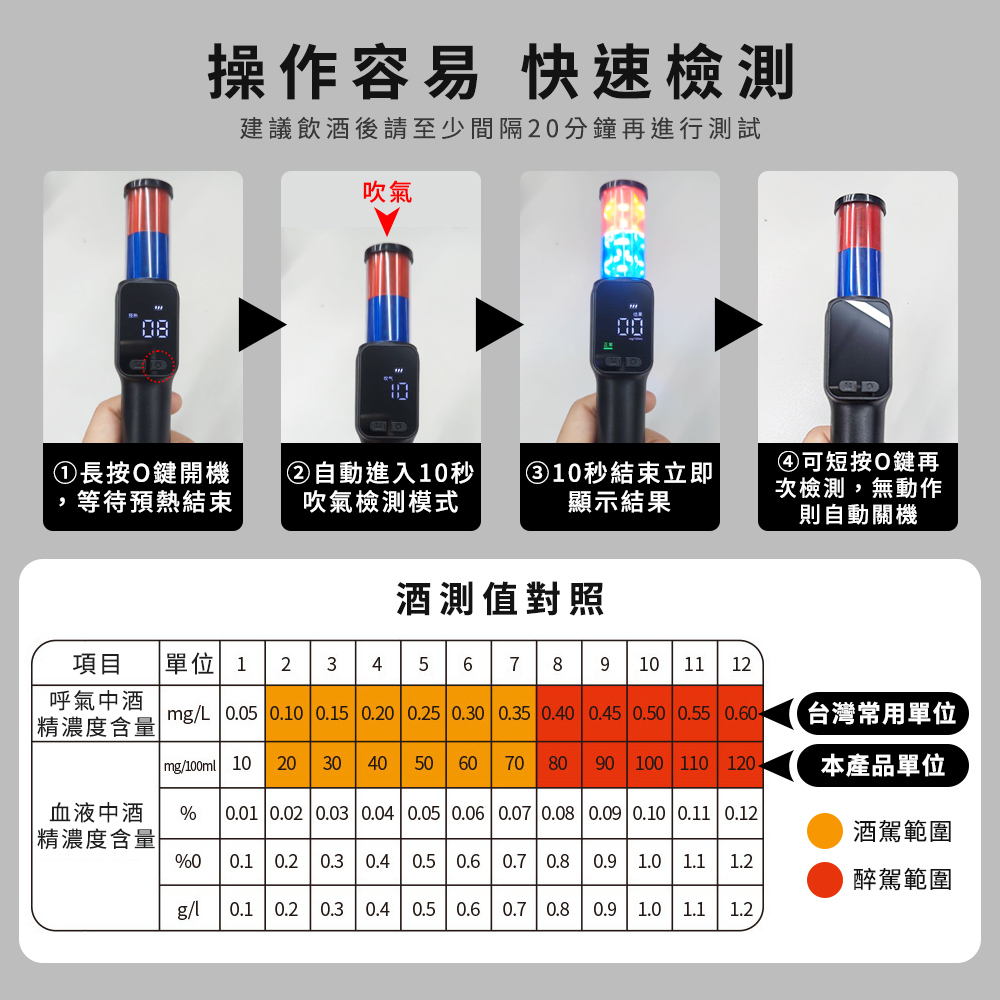 - 快速檢測與語音提示:幾秒內即可得出結果,並透過螢幕文字/燈光提示酒精濃度,直觀易懂。